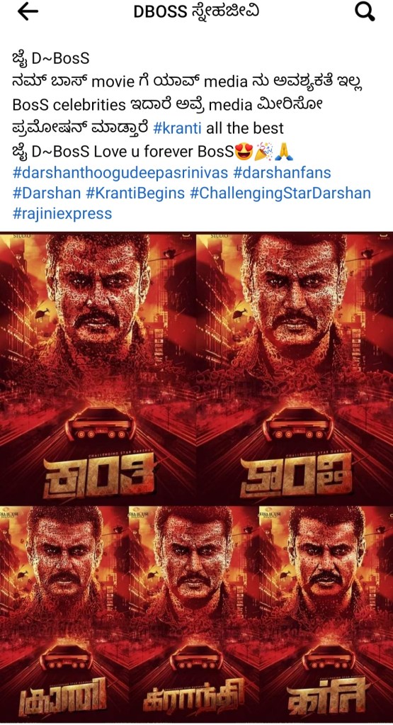 DBOSS Kranti movie Posted byRakesh PHJune 15, 2022June 15, 2022Posted inUncategorizedTags:Darshan Thoogudeepa sreenivas, DBosS Nam Boss ge yav media nu beda fans ne saku avre promote madi kodtare jai DBosS😍 Share this: Share on X (Opens in new window) X Share on Facebook (Opens in new window) Facebook Like Loading... Related